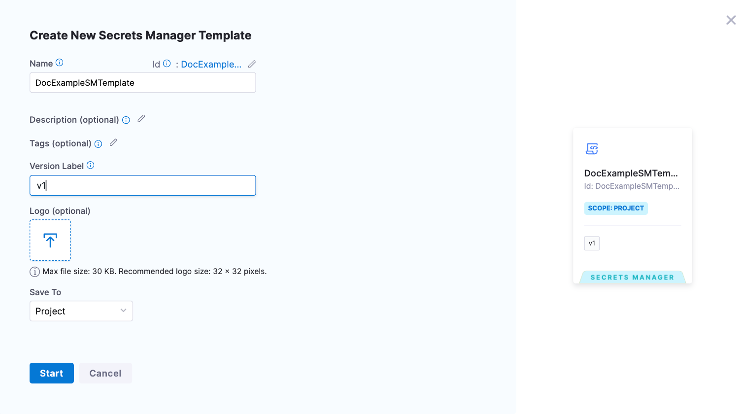 This topic shows you how to create a Secret Manager Template at the Project scope.